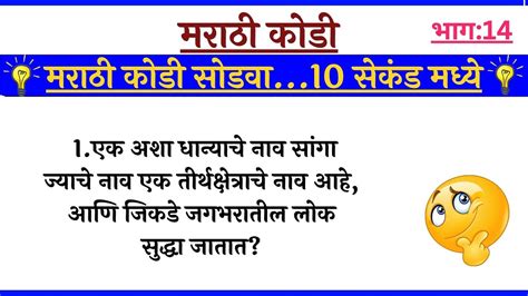 मराठी कोडी (riddles in marathi) 1) अशा भाजीचे नाव सांगा ज्या भाजी मध्ये एका प्रसिद्ध शहराचे नाव लपलेले आहे… उत्तर : 1.4m views 4 years ago pune. वांगी आणि शिमला 2) एका माणसाचे पाच अक्षरी नाव काय ?