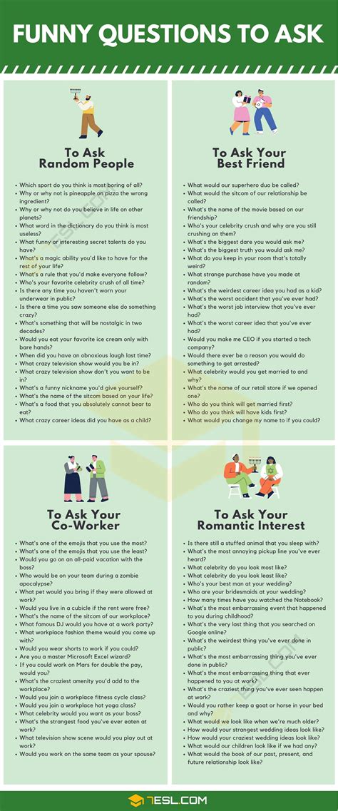 Funny questions help break the ice in social situations. These 250 funny questions to ask anyone, from friends and family to coworkers and acquaintances, will have everyone giggling. Web get ready to laugh!